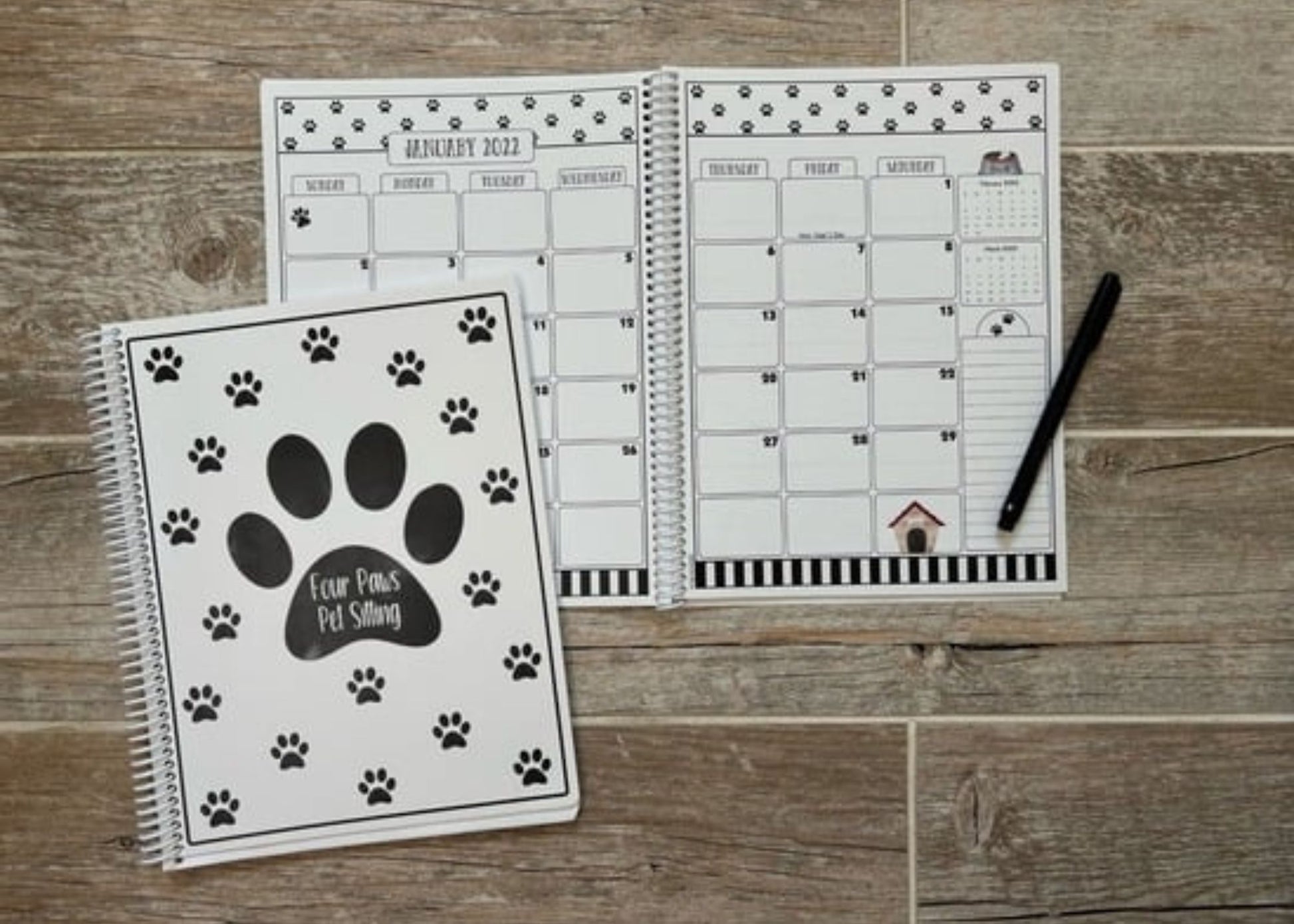 2025-2026 Pet Sitter Planner & Organizer with Pet and Owner Info Pages. Large or Medium. BLACK PAW PRINTS DESIGN DESIGN