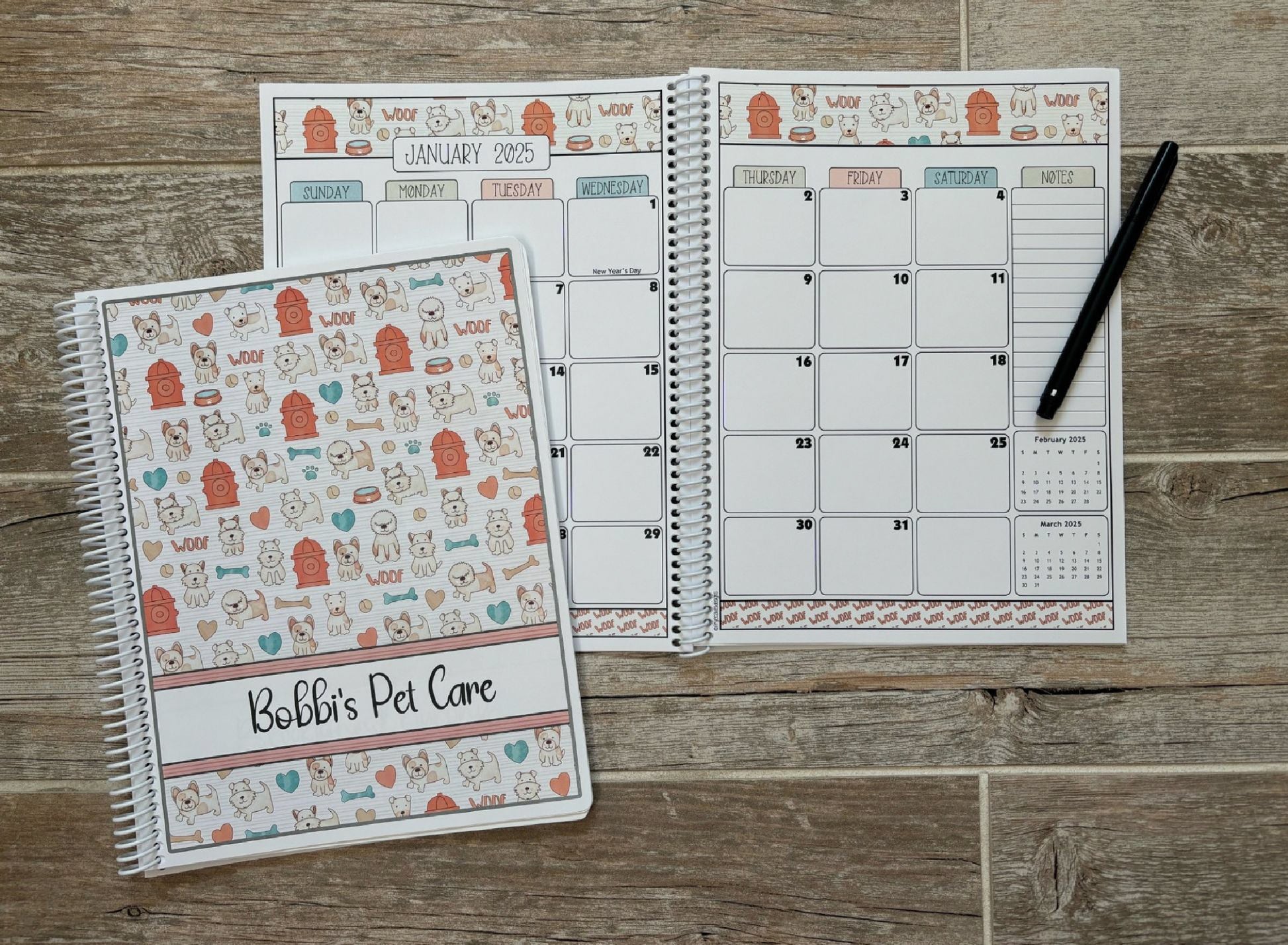 2025-2026 Pet Sitter Planner & Organizer with Pet and Owner Info Pages. Large or Medium. ORANGE & TAN PUPS DESIGN