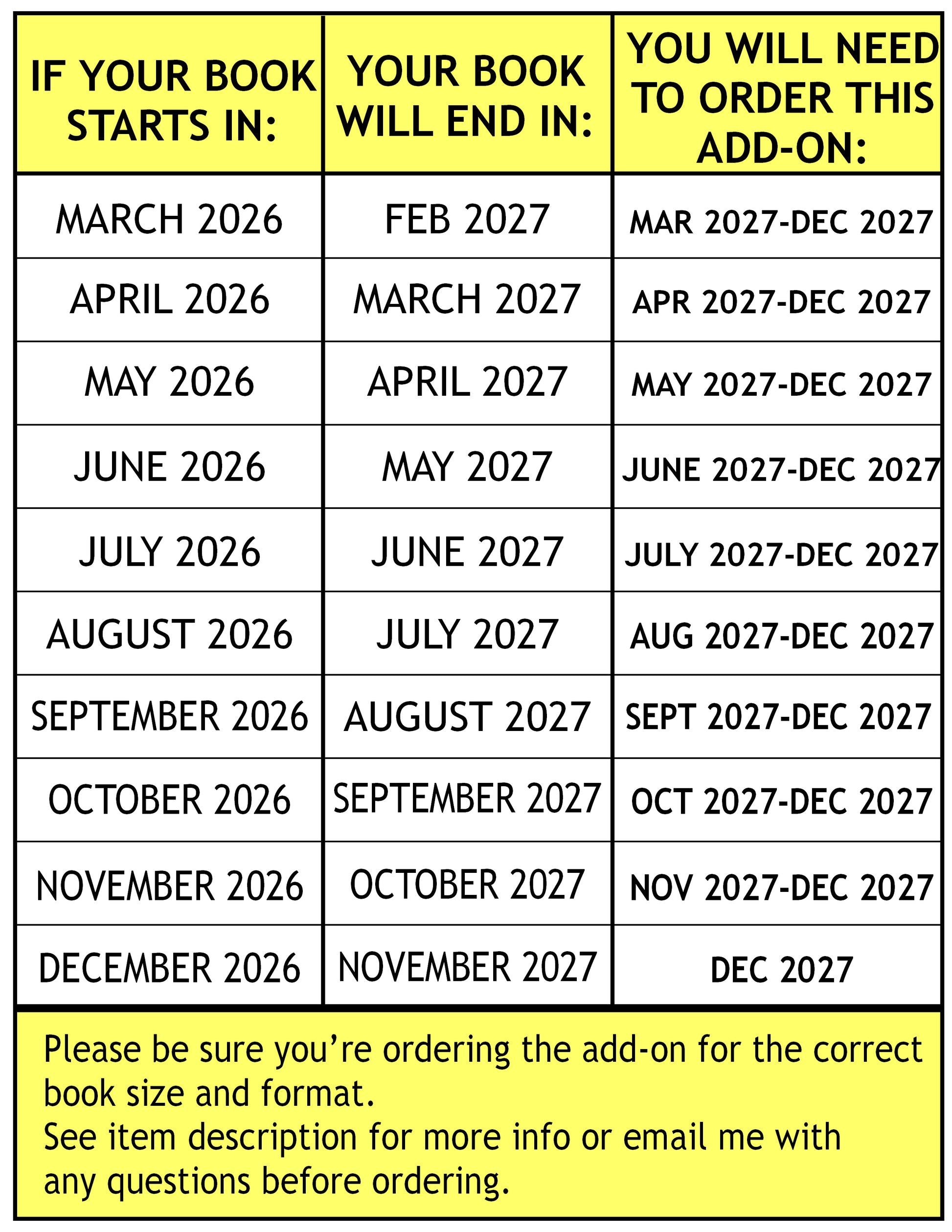 Step 2: Using the chart in the pictures in this listing, choose the correct extra months you will need with the correct book format/size.