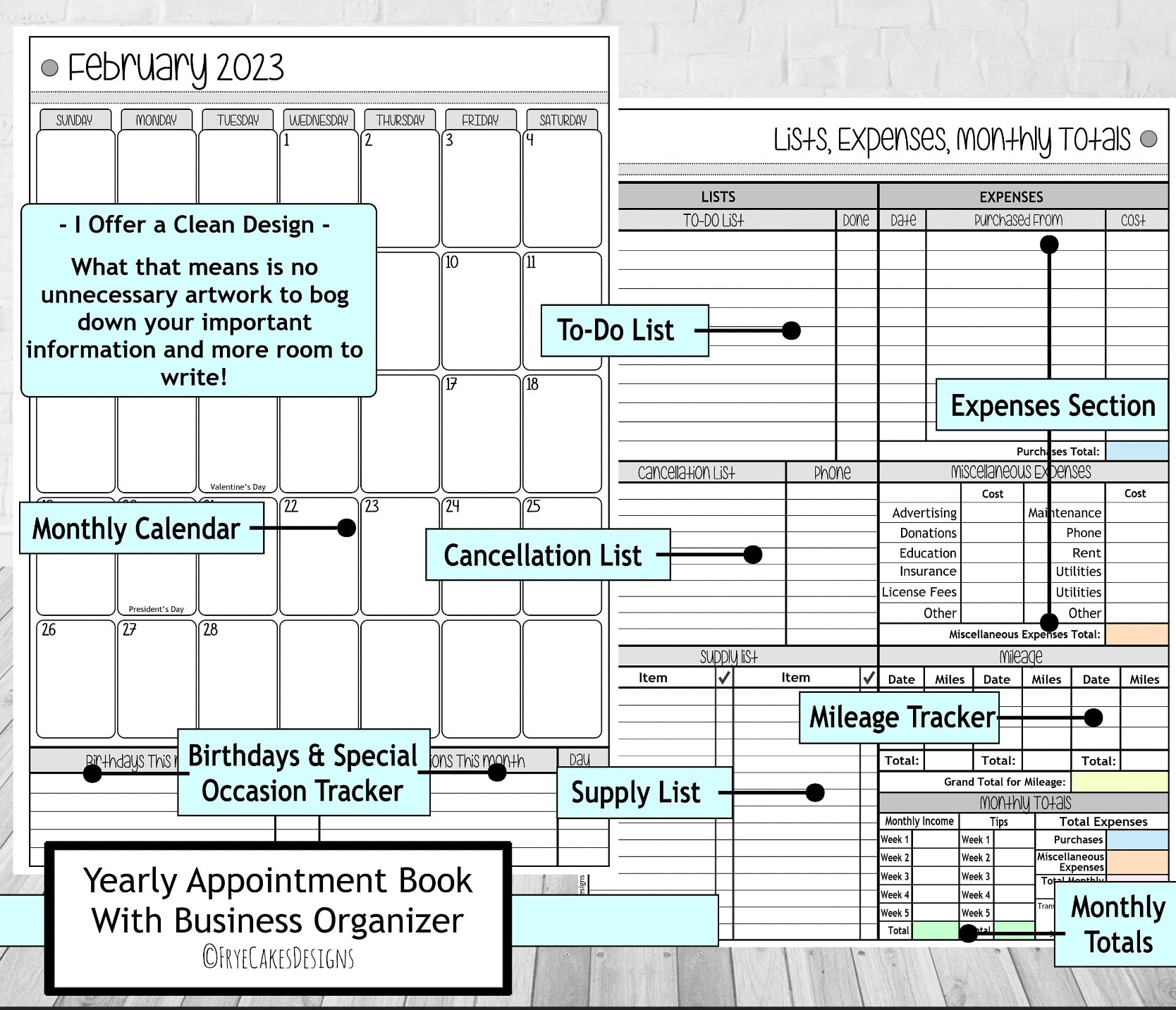 Includes Appointment Book with Business Organizer, 1 plastic pocket in back of book for holding money, receipts, notes, etc. (pocket size is 10 x 6" in Large Books. 7.5" x 5.5" in Medium books), alphabetical client contact list in back of book (name and number) and metal pen/pencils holder clip.