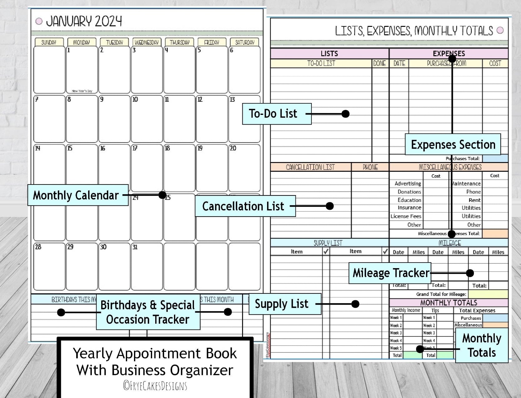 Includes Appointment Book with Business Organizer, 1 plastic pocket in back of book for holding money, receipts, notes, etc. (pocket size is 10 x 6" in Large Books. 7.5" x 5.5" in Medium books), alphabetical client contact list in back of book (name and number) and metal pen/pencils holder clip.