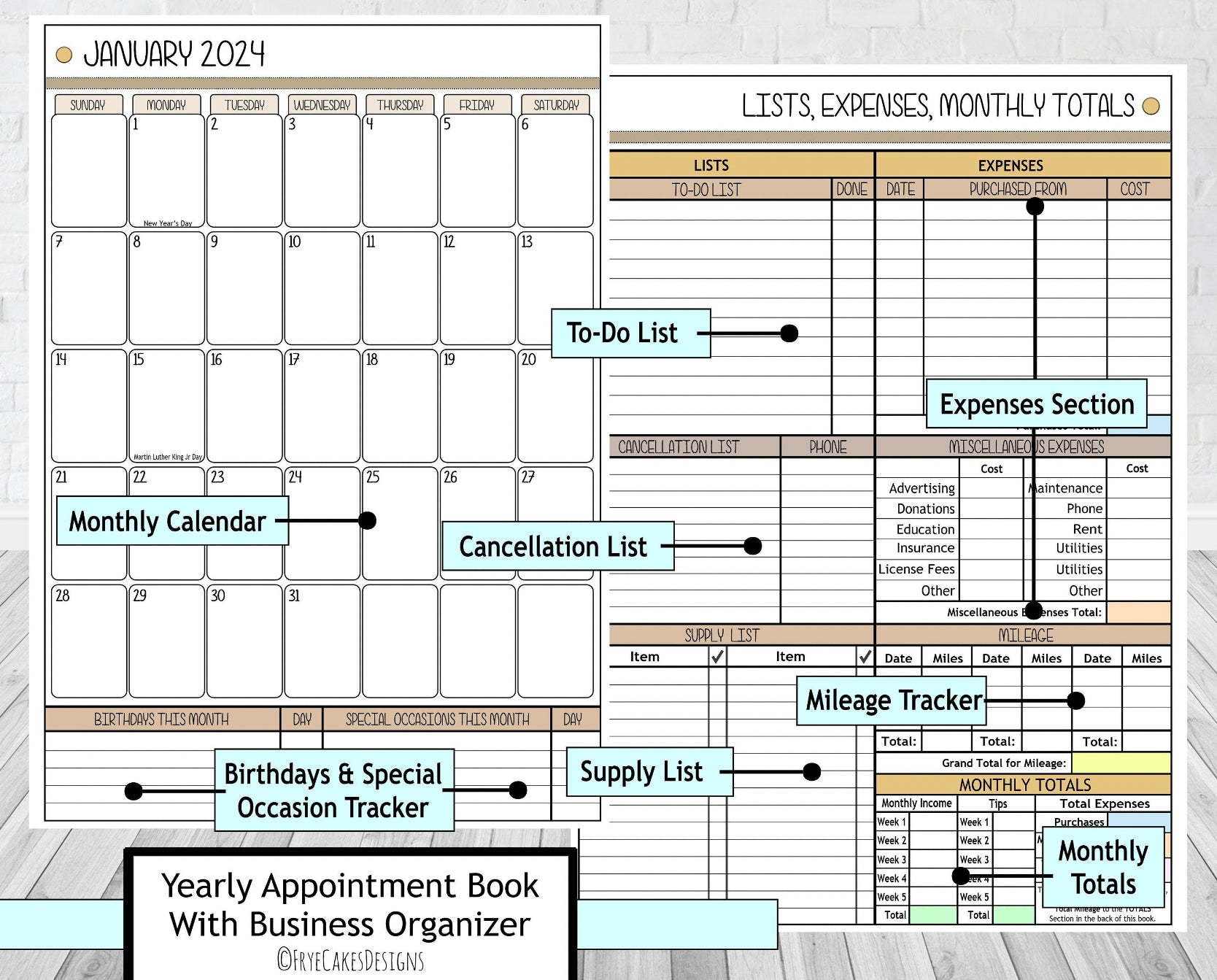 Includes Appointment Book with Business Organizer, 1 plastic pocket in back of book for holding money, receipts, notes, etc. (pocket size is 10 x 6" in Large Books. 7.5" x 5.5" in Medium books), alphabetical client contact list in back of book (name and number) and metal pen/pencils holder clip.
