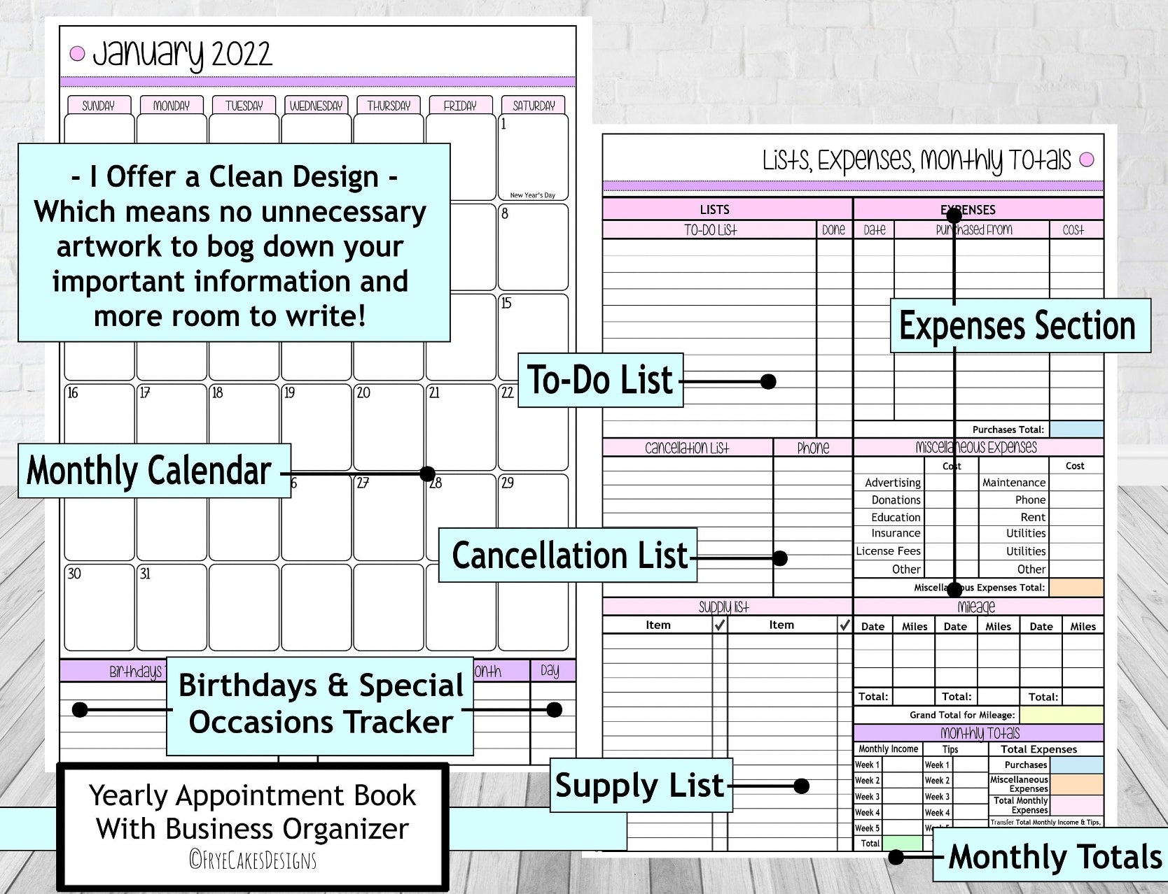 Includes Appointment Book with Business Organizer, 1 plastic pocket in back of book for holding money, receipts, notes, etc. (pocket size is 10 x 6" in Large Books. 7.5" x 5.5" in Medium books), alphabetical client contact list in back of book (name and number) and metal pen/pencils holder clip.