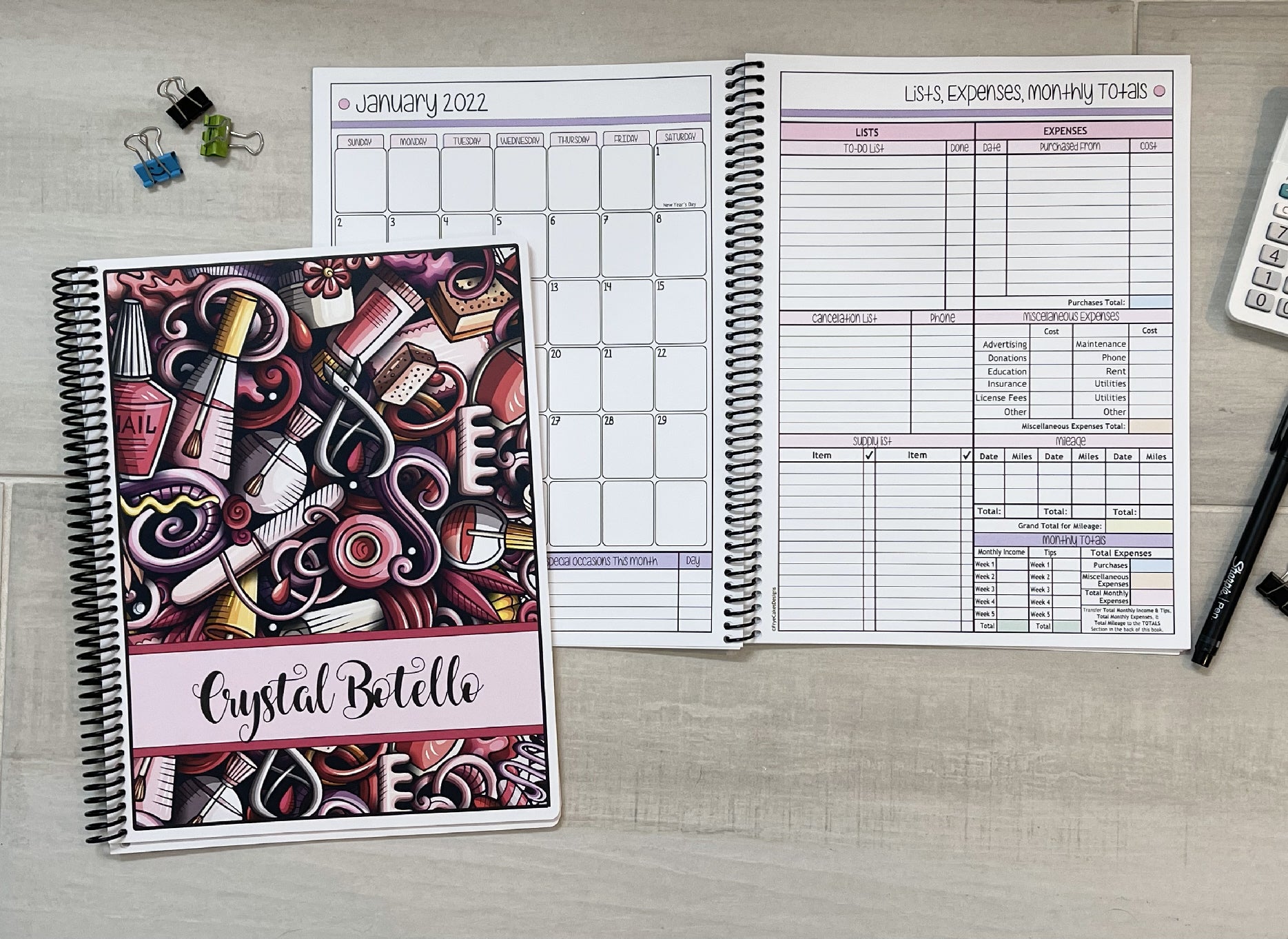 Book with Business Organizer, 1 plastic pocket in back of book for holding money, receipts, notes, etc. (pocket size is 10 x 6" in Large Books. 7.5" x 5.5" in Medium books), alphabetical client contact list in back of book (name and number), a metal pen/pencil holder clip, PLUS Planner Stickers for Nail Specialists.