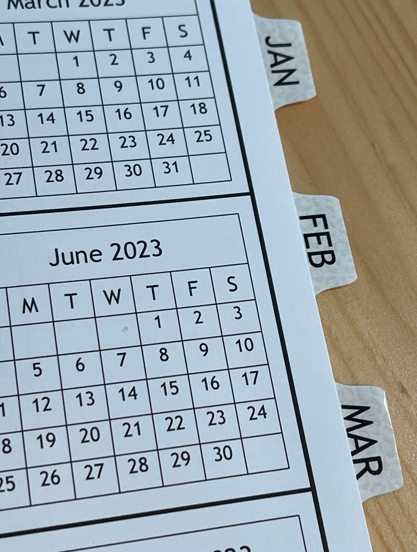 Each month starts with a Monthly Calendar page on the left side and a monthly business organizer page on the right side, followed by appointment pages for that month. While there are no monthly divider pages, there are monthly tabs.