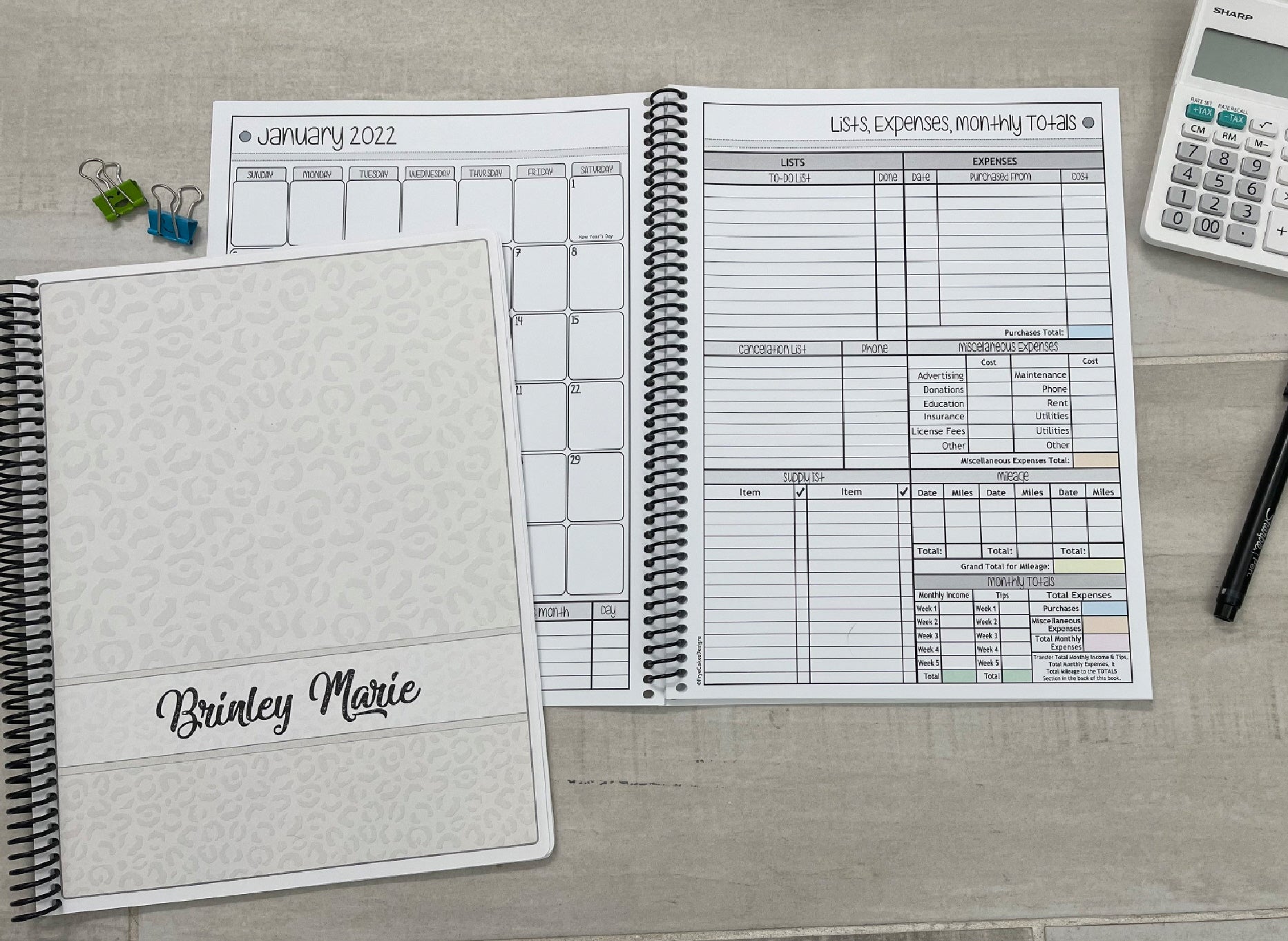Book with Business Organizer, 1 plastic pocket in back of book for holding money, receipts, notes, etc. (pocket size is 10 x 6" in Large Books. 7.5" x 5.5" in Medium books), alphabetical client contact list in back of book (name and number), a metal pen/pencil holder clip, PLUS Planner Stickers (Hair or Nails)
