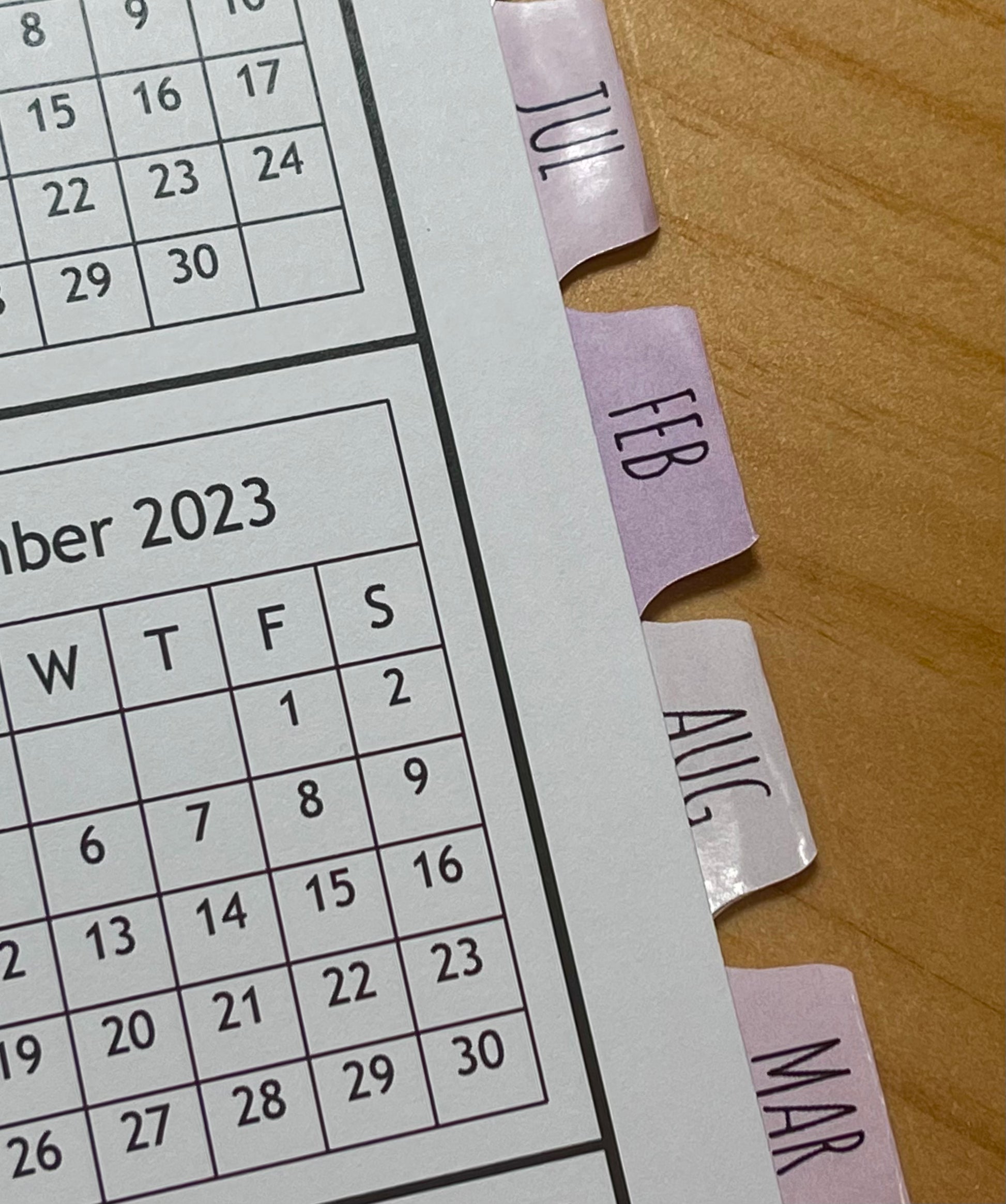 Each month starts with a Monthly Calendar page on the left side and a monthly business organizer page on the right side, followed by appointment pages for that month. While there are no monthly divider pages, there are monthly tabs.