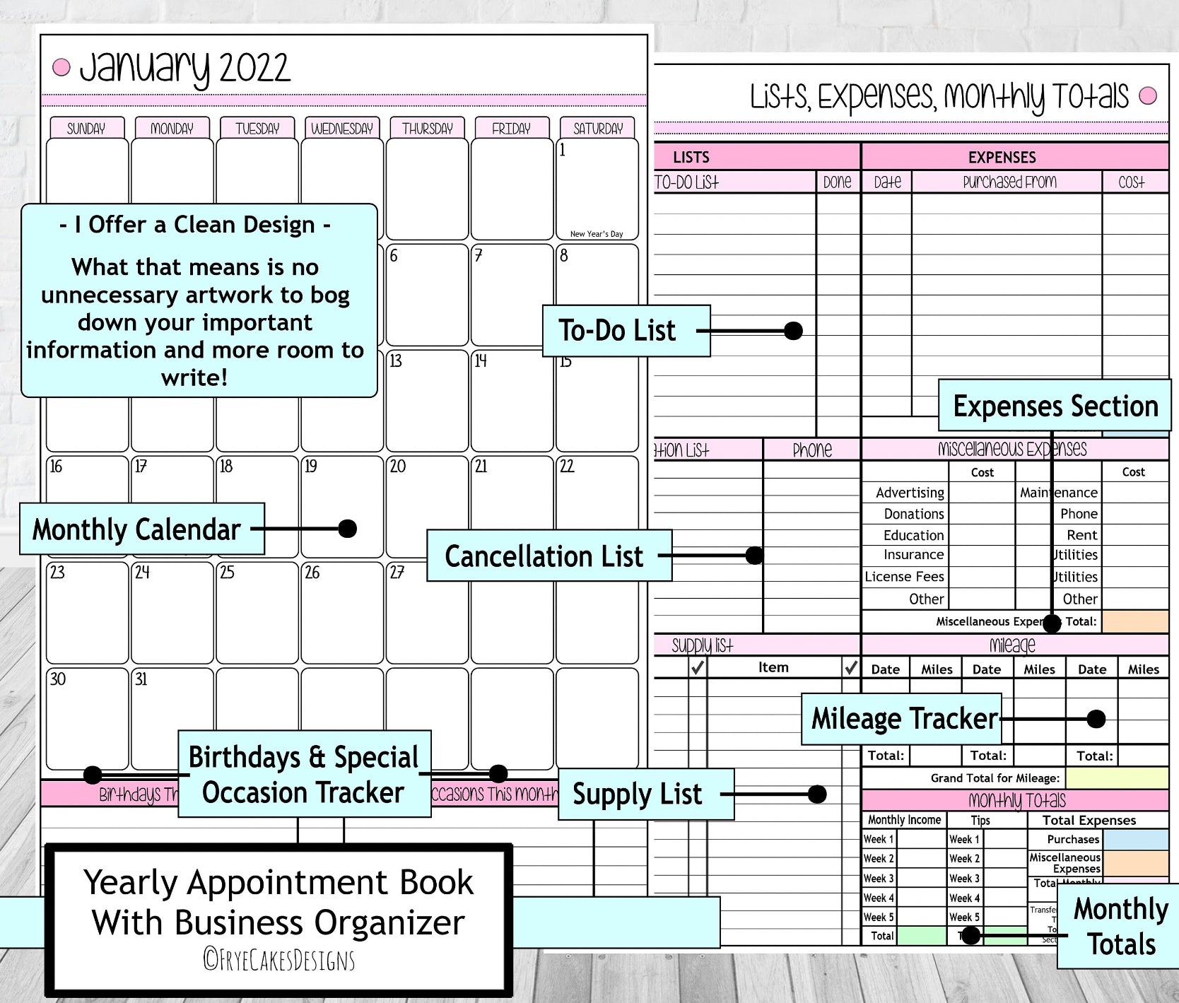 Includes Appointment Book with Business Organizer, 1 plastic pocket in back of book for holding money, receipts, notes, etc. (pocket size is 10 x 6" in Large Books. 7.5" x 5.5" in Medium books), alphabetical client contact list in back of book (name and number) and metal pen/pencils holder clip.