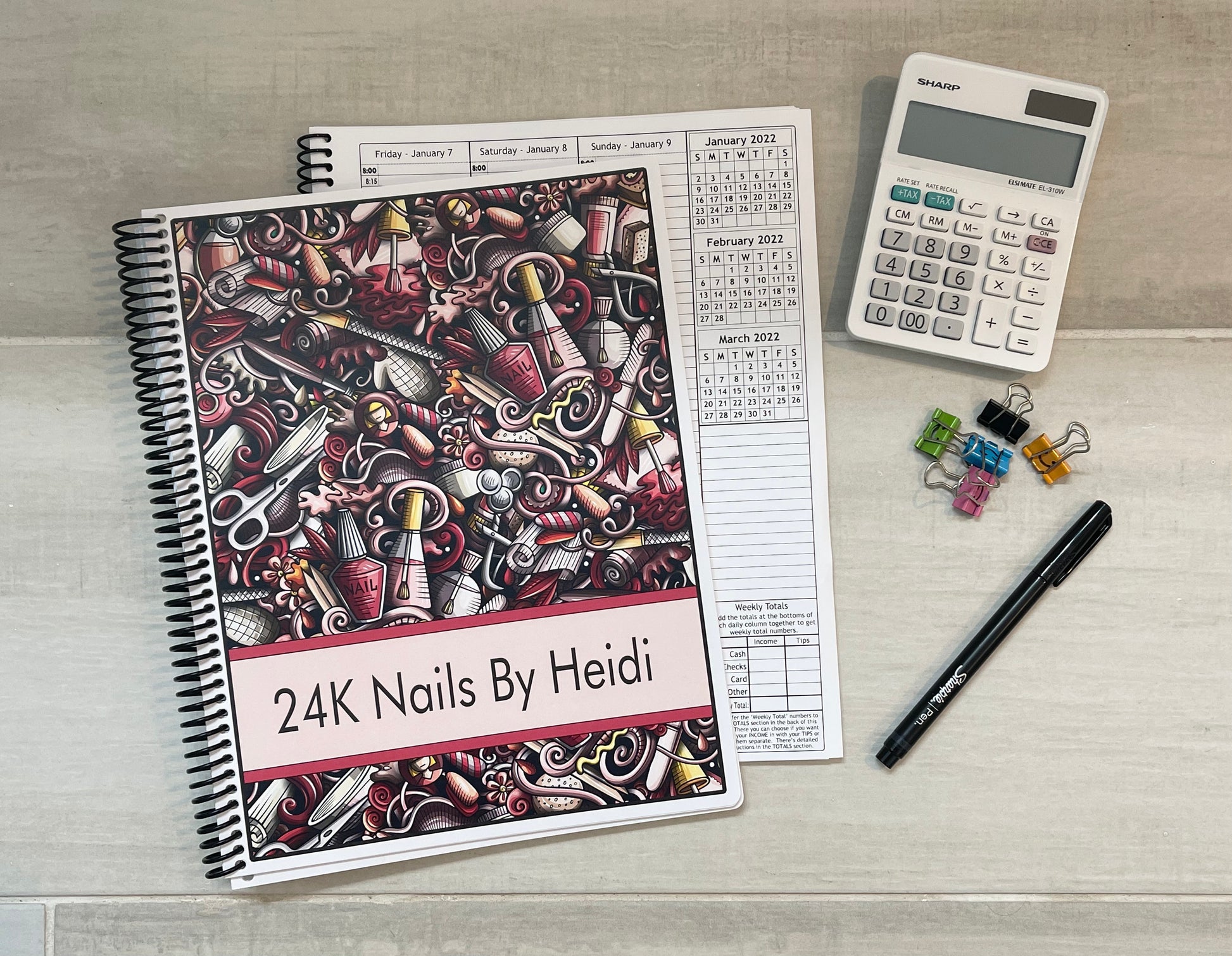 Book with Business Organizer, 1 plastic pocket in back of book for holding money, receipts, notes, etc. (pocket size is 10 x 6" in Large Books. 7.5" x 5.5" in Medium books), alphabetical client contact list in back of book (name and number), a metal pen/pencil holder clip, PLUS Planner Stickers for Nail Specialists.