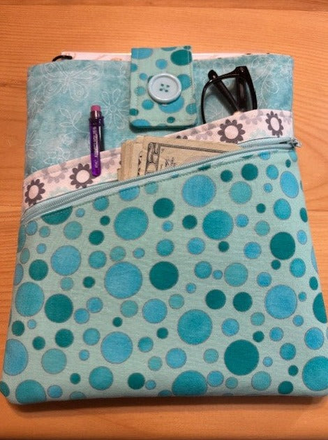 - Aqua Dots Design with accent button, includes 1 front zipper pocket and one front slip pocket plus the larger open pocket that your book will slip into.
