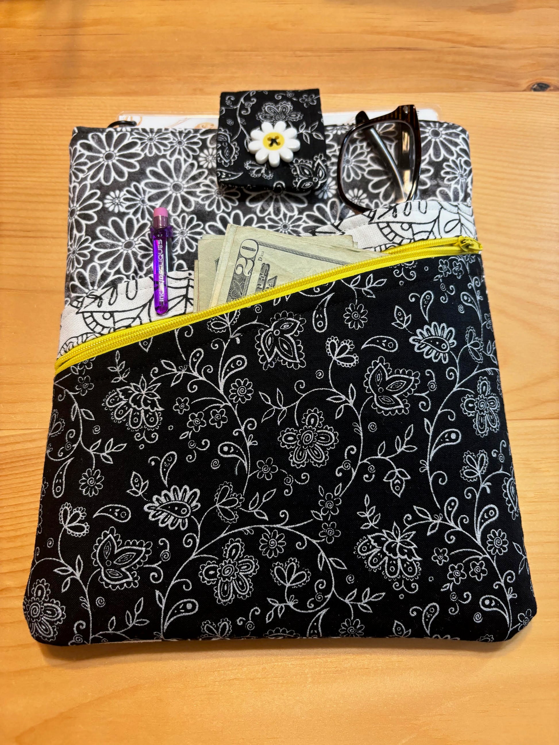- Black and White Daisy Design with accent button, includes 1 front zipper pocket and one front slip pocket plus the larger open pocket that your book will slip into.