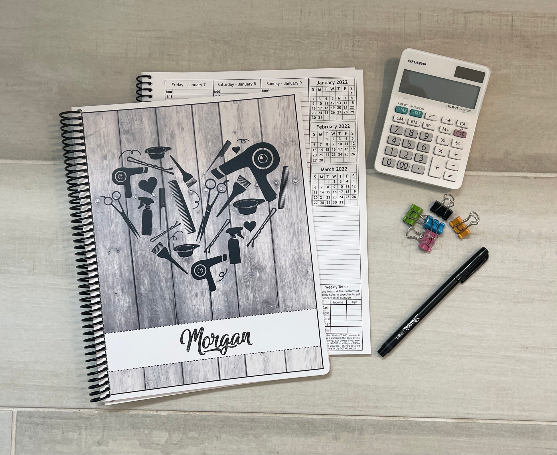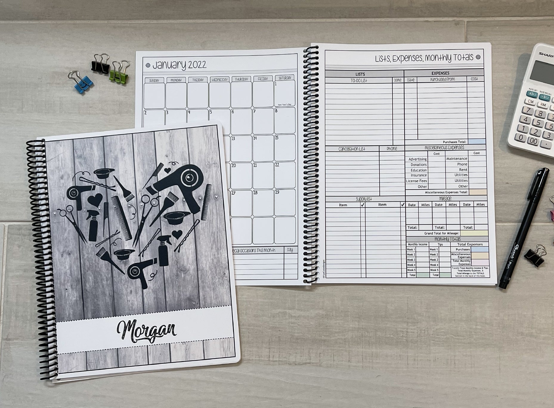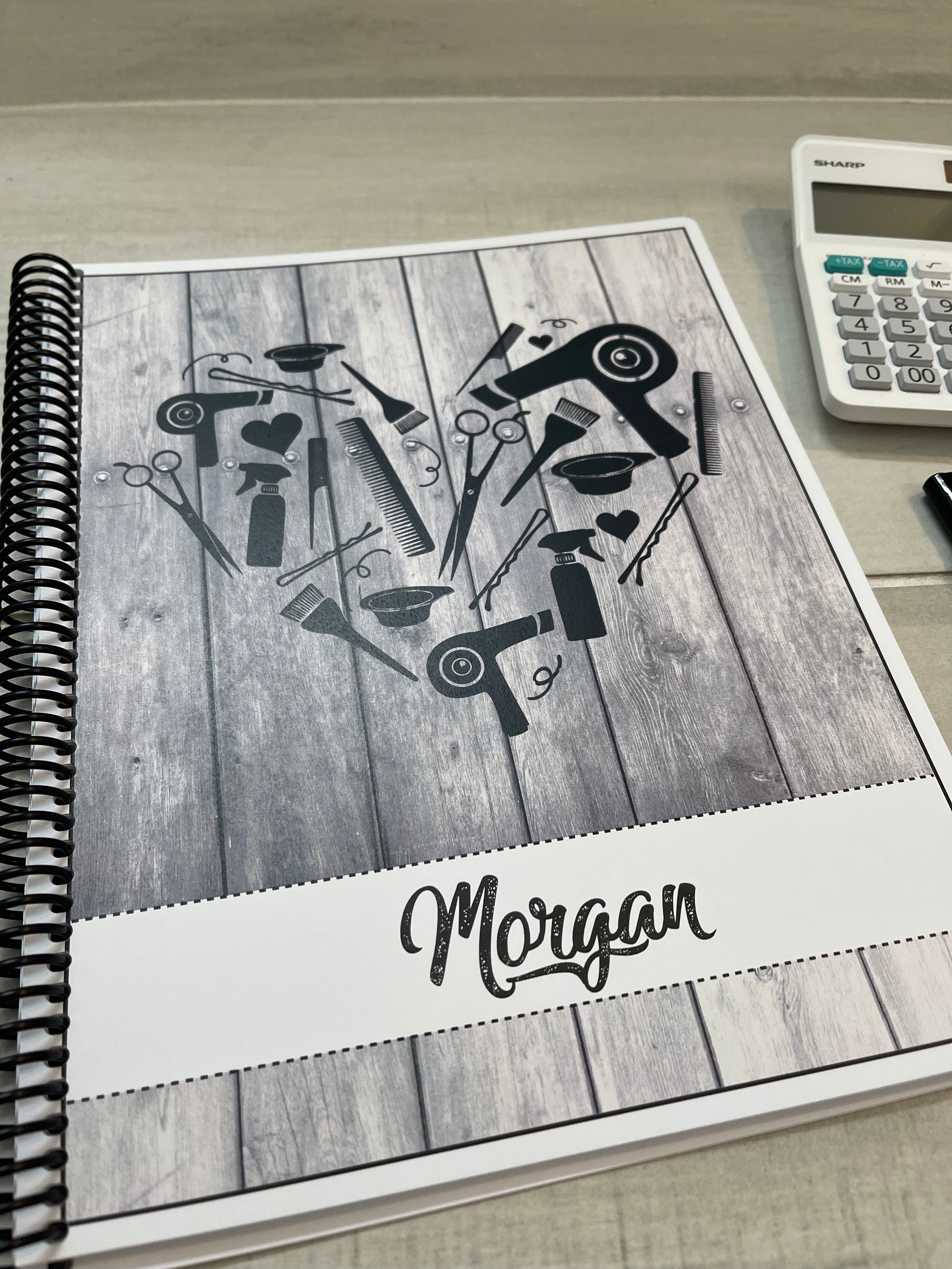 Book with Business Organizer, 1 plastic pocket in back of book for holding money, receipts, notes, etc. (pocket size is 10 x 6" in Large Books. 7.5" x 5.5" in Medium books), alphabetical client contact list in back of book (name and number), a metal pen/pencil holder clip, PLUS Planner Stickers for Stylists.